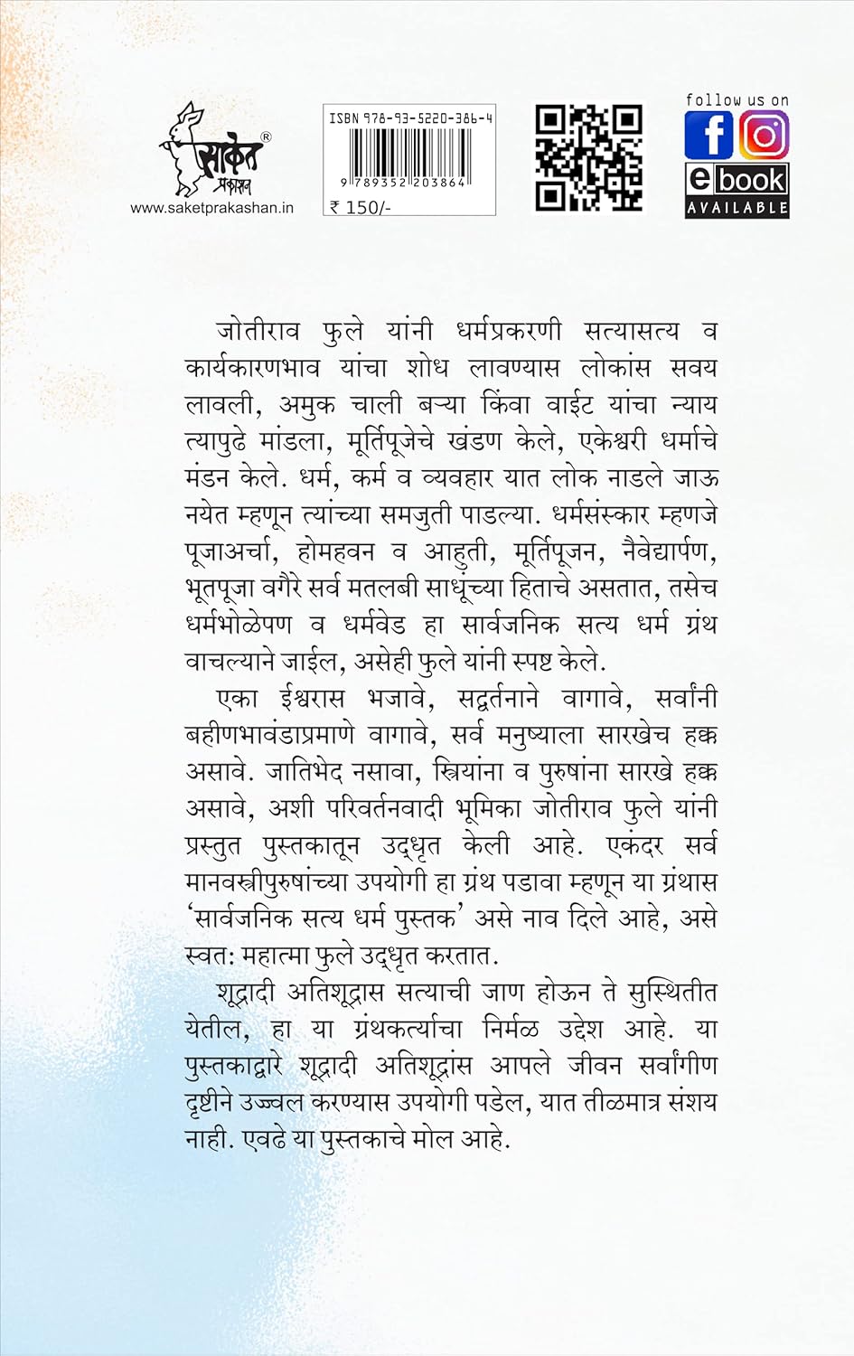 एका ईश्वरास भजावे, सद्वर्तनाने वागावे, सर्वांनी बहीणभावंडाप्रमाणे वागावे, सर्व मनुष्याला सारखेच हक्क असावे. जातिभेद नसावा, स्त्रियांना व पुरुषांना सारखे हक्क असावे, अशी परिवर्तनवादी भूमिका जोतीराव फुले यांनी प्रस्तुत पुस्तकातून उद्धृत के ली आहे. एकंदर सर्व मानवस्त्रीपुरुषांच्या उपयोगी हा ग्रंथ पडावा म्हणून या ग्रंथास ‘सार्वजनिक सत्य धर्म पुस्तक’ असे नाव दिले आहे, असे स्वत: महात्मा फुले उद्धृत करतात.