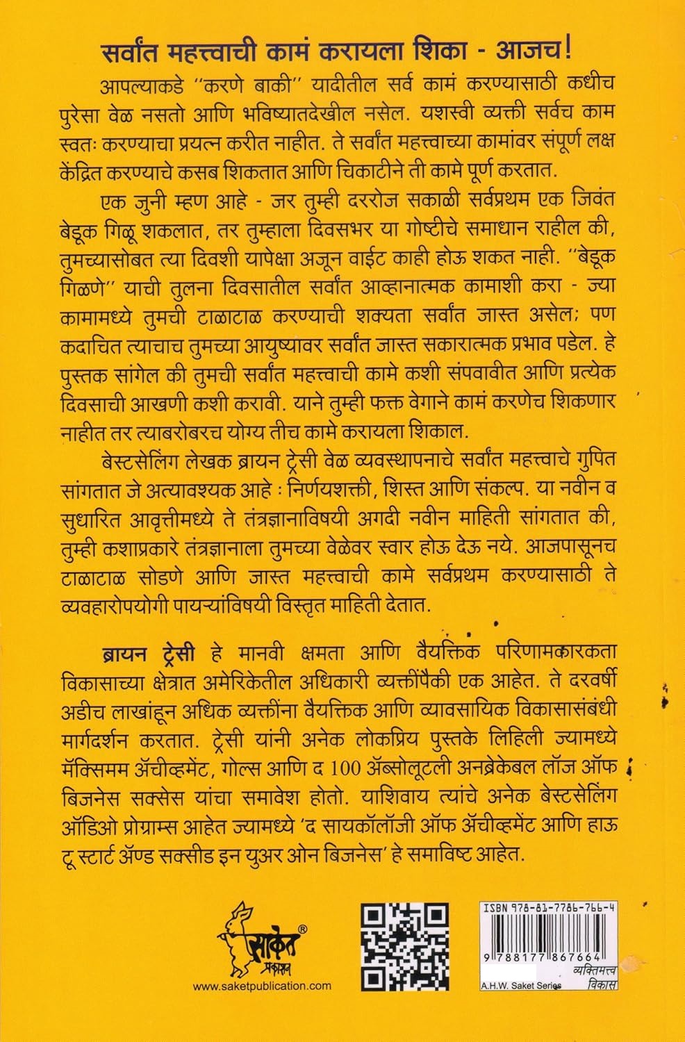 बेस्टसेलिंग लेखक ब्रायन ट्रेसी वेळ व्यवस्थापनाचे सर्वांत महत्त्वाचे गुपित सांगतात जे अत्यावश्यक आहे : निर्णयशक्ती, शिस्त आणि संकल्प. या नवीन व सुधारित आवृत्तीमध्ये ते तंत्रज्ञानाविषयी अगदी नवीन माहिती सांगतात की, तुम्ही कशाप्रकारे तंत्रज्ञानाला तुमच्या वेळेवर स्वार होऊ देऊ नये. आजपासूनच टाळाटाळ सोडणे आणि जास्त महत्त्वाची कामे सर्वप्रथम करण्यासाठी ते व्यवहारोपयोगी पायऱ्यांविषयी विस्तृत माहिती देतात.